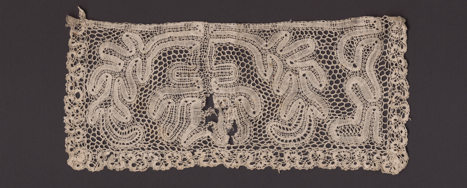 Pásiková čipka, typ spišský. Materiál je nebielená ľanová niť, motívy sú rastlinné pletené v riečičke. Čipka je pravdepodobne z pôlky.