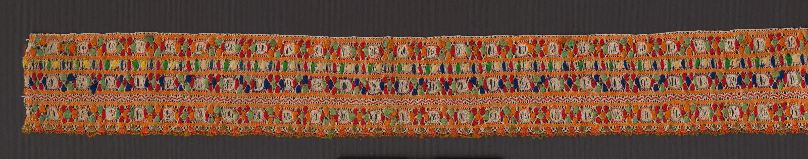 Mnohopárová čipka so zúbkami, typ šoporniansky. Čipka je zložená zo šiestich radov oddelených plátenkom. Väzby jednopárový pletenec, ploštičky, pavúčky, hadík. Ploštičky sa striedajú s pavúčkom, tento rad sa trikrát opakuje (a b a c a d).