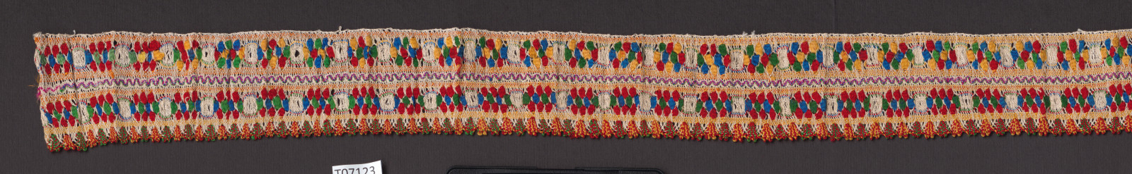 Paličkovaná čipka z pestrých hodvábnych nití, typ šoporniansky. Mnohopárová čipka je komponovaná do troch radov ohraničených plátenkovým pásikom, okraj je ukončený oblými zúbkami. Čipká je hustá, väzby ploštičky, pavúčik, zúbky, plátenko, pletenec.