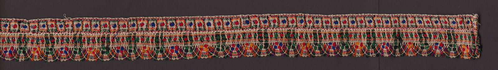 Mnohopárová čipka so zúbkami, typ šoporniansky. Čipka je zložená z dvoch častí, ktoré sú spolu zošité. Väzby plátenko hladké a prekladané, ploštičky a pletence.