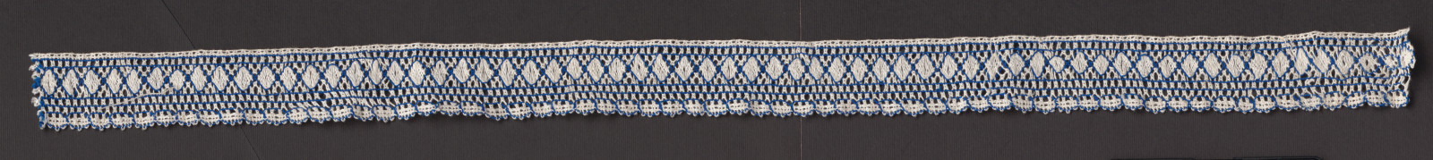 Mnohopárová čipka, typ novomestský. Vyrobená je bavlnených nití, motívy sú doplnené modrou bavlnkou.
