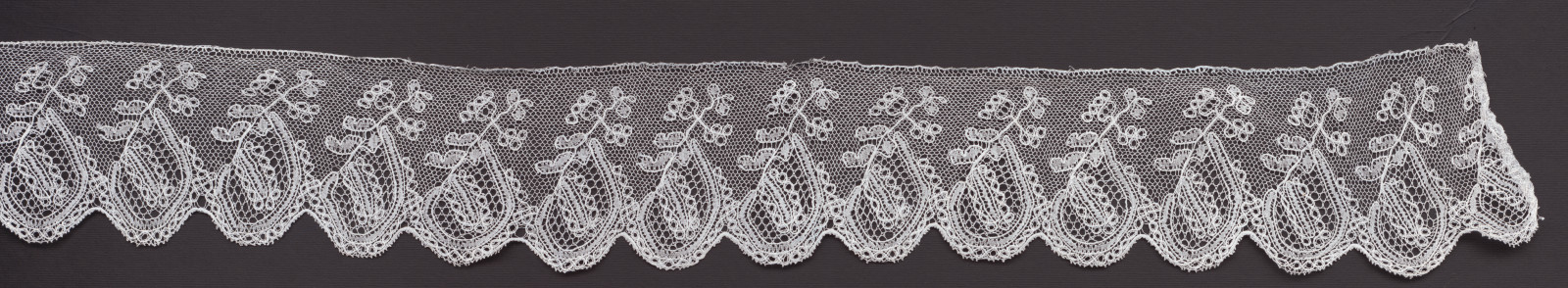 Paličkovaná čipka z bielych bavlnených nití, typ krajniansky. Základ tvorí riečička pletená tylovou väzbou do ktorej je vpletený motív. Na vonkajšom okraji sú zúbky. Väzby plátenko, pletence, oká, mitky, vplietanie hrubšej nite. Čipka je naškrobená.