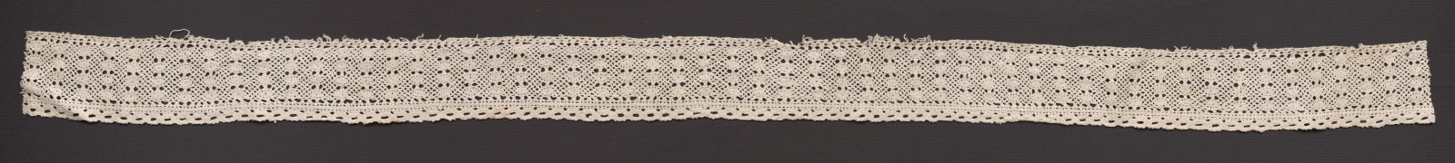 Mnohopárová čipka, typ hontiansky. Materiál ľanové nite, väzby pletenec, pavúčky, plátenko, hadík. Pavúčky sú husto ukladané v riečičke.