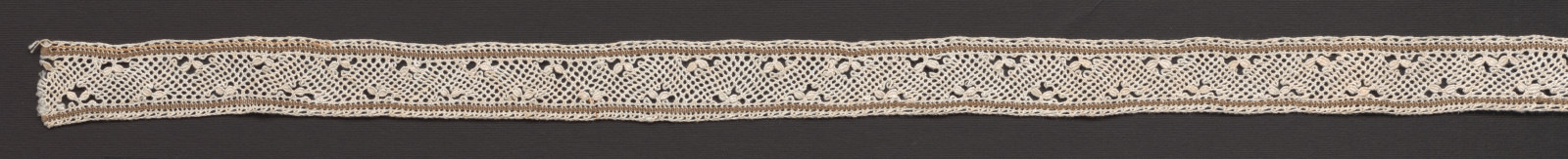 Mnohopárová vložka, typ hontiansky. Vyrobená je bavlnených nití béžovej farby, po okrajoch je pás z hnedej bavlnky. V mriežke sú pri okrajoch pletené dva lístky.