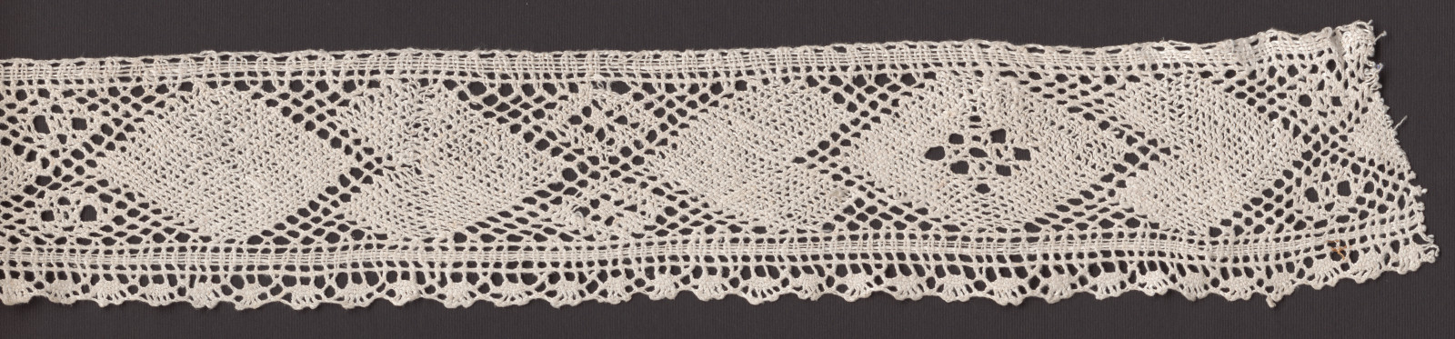 Paličkovaná mnohopárova čipka, typ hontiansky. Čipka je z ľanových nití, vzor je geometrický (srdiečka a kosoštvorce) upletené plátenkovou väzbou. Na vonkajšom okraji sú drobné zúbky.