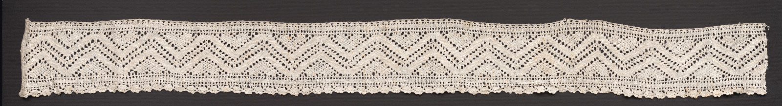 Mnohopárová paličkovaná čipka, typ hontiansky. Materiál ľanové nite, väzby plátenko, polpára, pletenec. Vzor znázorňuje lomenú vlnovku s motívom srdiečok. Na vonkajšom okraji zúbky.