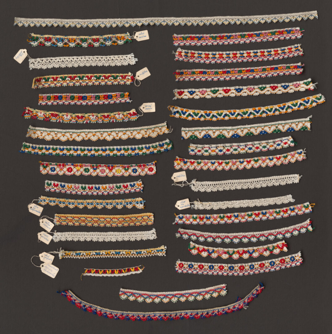 Vzorník čipiek na čepce od Márie Tuhárskej zo Senohradu (30 ks). Čipky sú mnohopárové, vyrobené z farebných tenkých bavlnených nití.