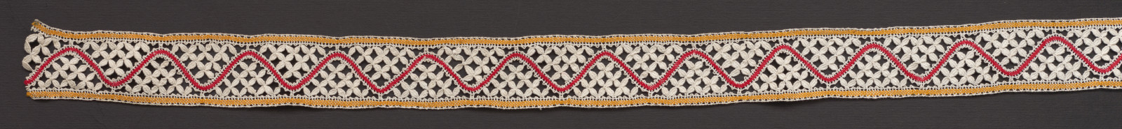 Mnohopárová čipky, typ hontiansky. Čipka je pletená zo samých lístkov, okraje a vlnovka prechádzajúca stredom sú pletené plátenkovou väzbou.
