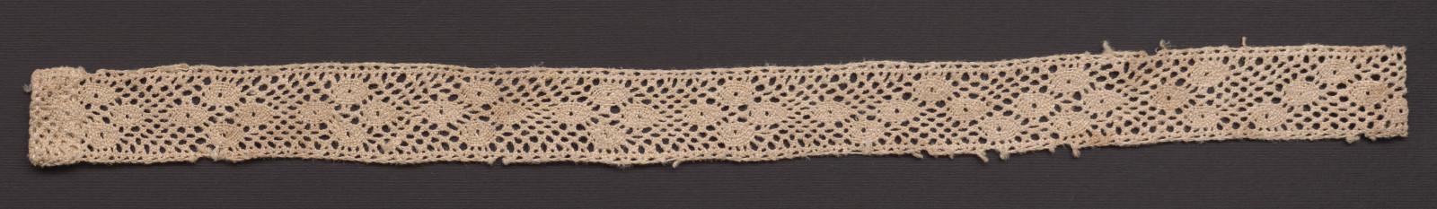 Mnohopárová čipka, typ novohradský. Materiál nebielená ľanová niť, väzby mriežka, pavúčiky. Staré číslo – 1830/1.