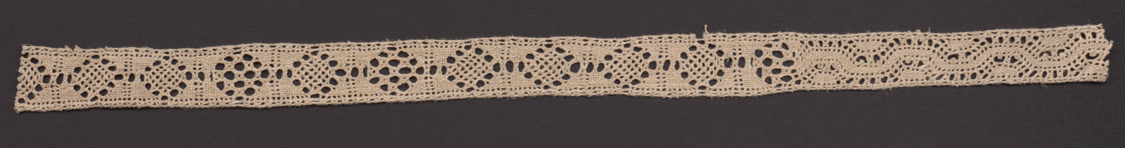 Mnohopárová vložka, typ novohradsky. Úzka čipka z nebielych nití, väzby riečička, plátenko, oká.