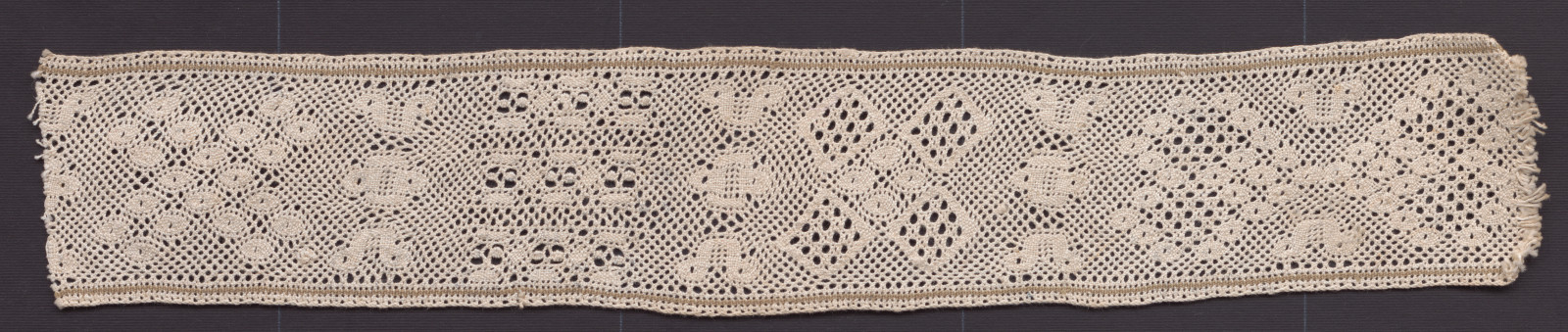 Mnohopárová čipka, typ novohradský. Čipka je veľmi hustá z bielych bavlnených nití. Základ je dierková riečička s geometrickými motívmi. Lokalita Turie Pole.