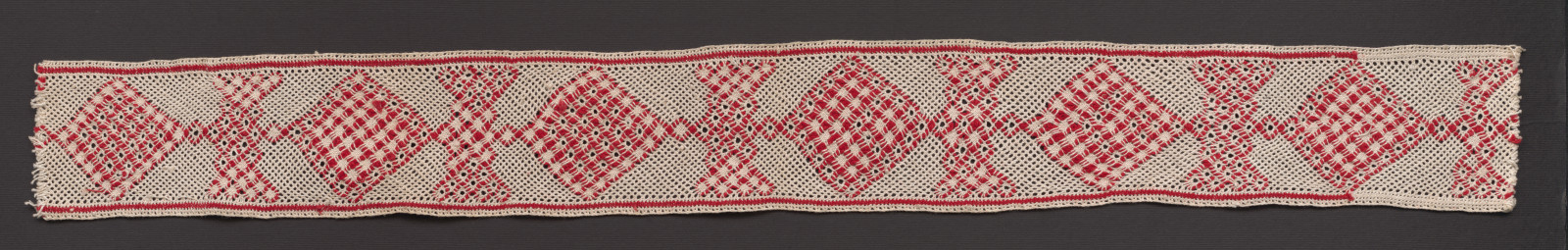Mnohopárová paličkovaná vložka, typ novohradský. Materiál biele a červené bavlnené nite. Základom je riečička, do ktorej je vťahovaná tmavočervená niť, ktorou sú tvorené geometrické motívy. Väzby plátenko, pletenec, oká.