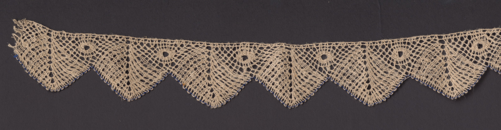Mnohopárová čipka so zúbkami, typ starohorský. Vyrobená je z konopných nití, na vonkajšom okraji je pletený jeden pár modrej bavlnky. Medzi zúbkami je riečička s pavúčikmi.