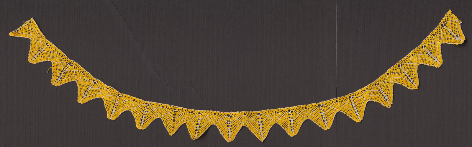 Mnohopárová čipka so zúbkami, typ starohorský. Vyrobená je zo žltých a bielych bavlnených nití, väzby jednopárové pletence, pavúčky a zúbky so stredovou osou.