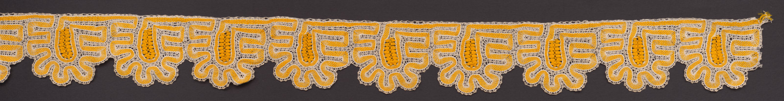 Pásikové čipky so zúbkami, typ slovenskogrobský. Vyrobené sú z bielej bavlnenej priadze a žltých hodvábnych nití. I.Väzby plátenko, pletence, ploštičky. Ploštičky sú uložené spôsobom typickým pre Slovenský Grob. II. Väzby plátenko, jednopárový pletenec.