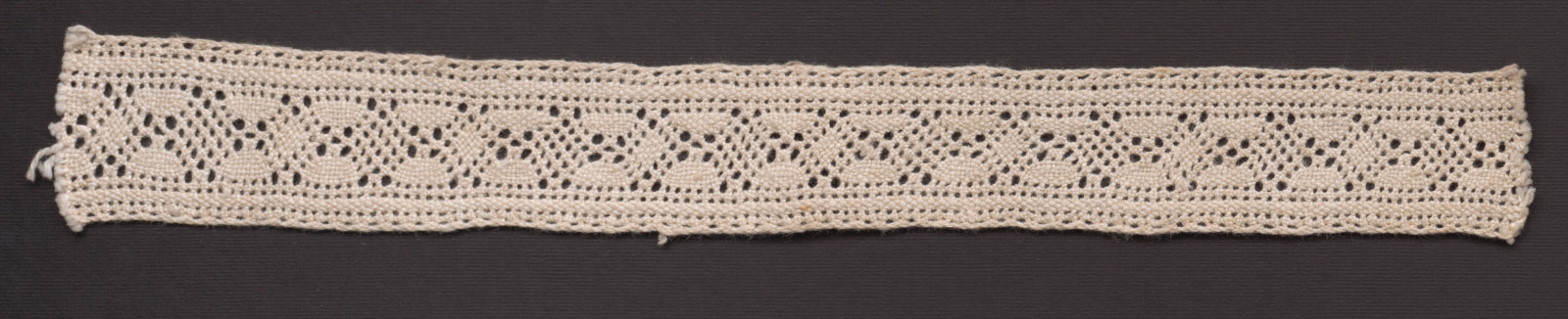 aličkovaná mnohopárova vložka, typ novohradský. Čipka je upletená z bielej bavlny, väzby plátenko, hrachovinka, dierky, pletence.