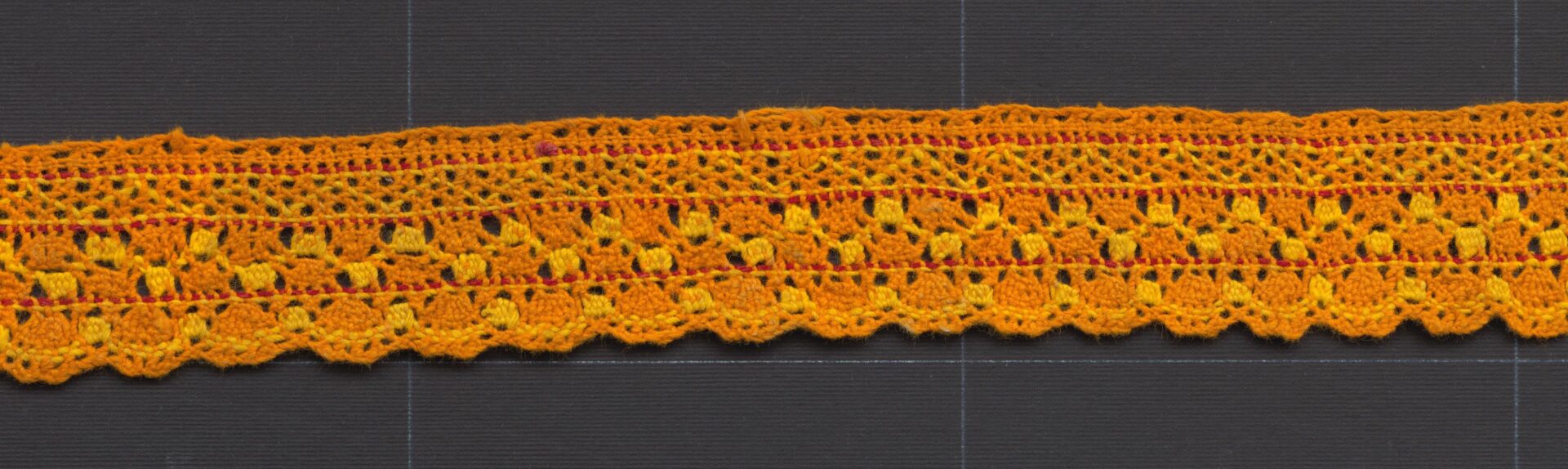 Paličkovaná čipka z bavlnených nití. Mnohopárová, typ novomestský. Používala sa na okružie ženských rukávcov.