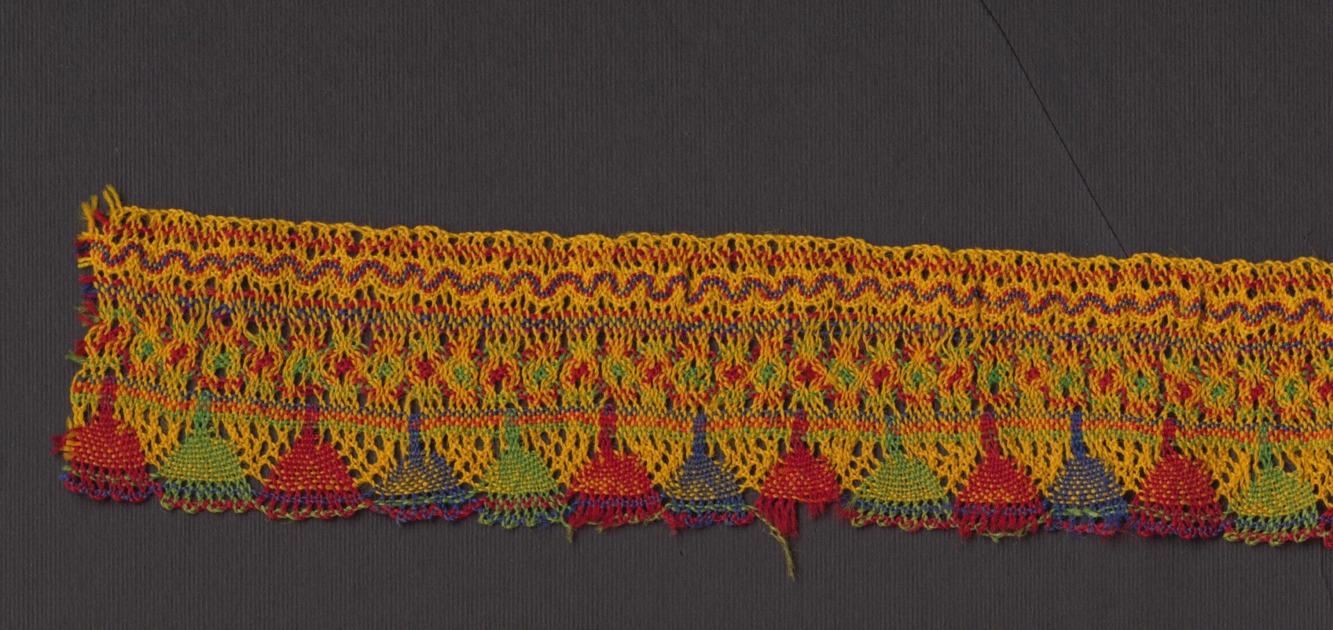 Mnohopárová čipka, typ šoporniansky. Čipka je z vyrobená z farebných vlnených nití. Na vonkajšom okraji sú oblé zúbky.