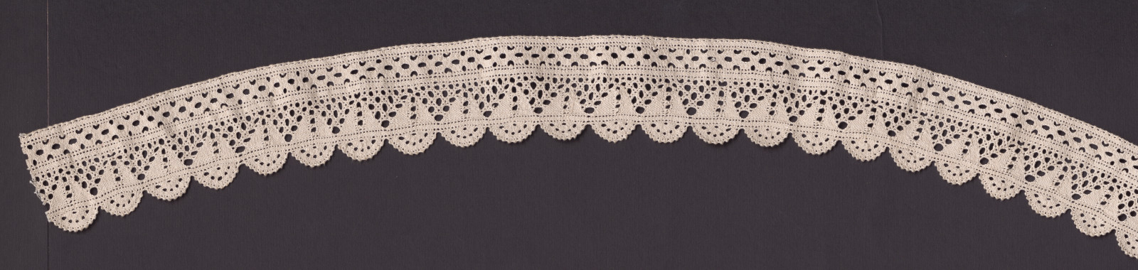 Mnohopárová čipka so zúbkami, typ novohradský. Zhotovená je z ľanových nití, väzby plátenko, hrachovinka, oká, pri hornom okraji vzor do tvaru osmičiek.