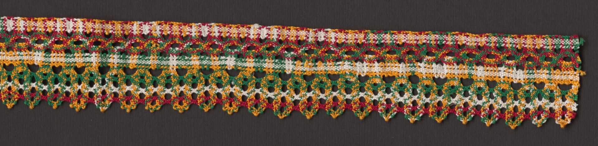 Mnohopárová paličkovaná čipka, typ liptovský. Vyrobená je z bavlnených nití, farby bordová, biela, žltá a zelená. Väzby plátenko, oká a dierky. Čipka ako na čepce, ale farebná. Výrobkyňa čipky bola odmenená II. cenou na súťaži ÚĽUV.