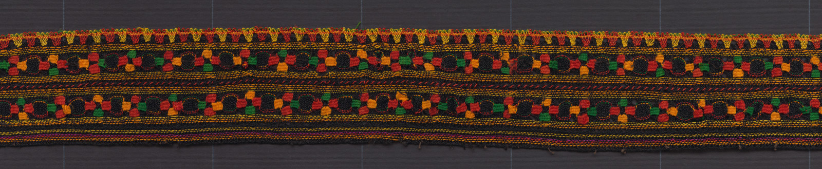 Paličkovaná čipka, typ šoporniansky. Čipka je mnohopárová, základ tvorí čierna farba v kombinácií s plôškami v červenej, oranžovej a zelenej farbe. Okraj je ukončený oblými zúbkami.