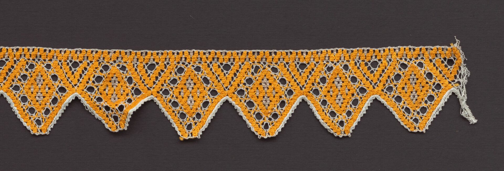 Mnohopárové paličkované čipky, typ piešťanský. Vyrobené sú z bielych nití na šitie, oranžových nití na vyšívanie a z kovových nití striebornej farby. Väzby ploštičky, dierky, mitky, opletanie. V zadnom pruhu sú dva rady plostičiek, v drieku oká opletené farebnou niťou. Čipky sú totožné.