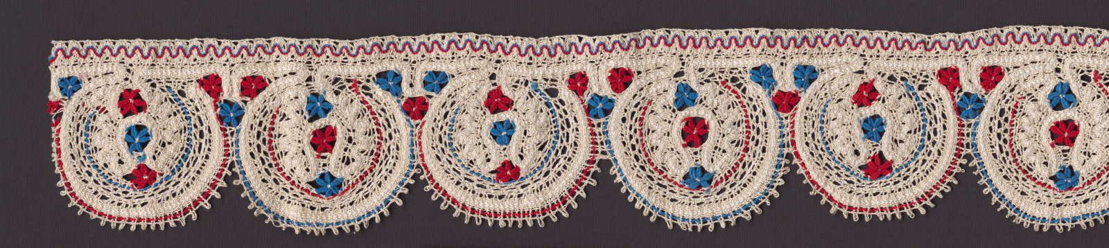 Pásiková paličkovaná čipka, typ hlbocký. Zhotovená je z ľanových továrenských nití a bielej, modrej a červenej perlovky. Väzby plátenko, lístky a pletence. Čipka sa používala na kútne plachty.