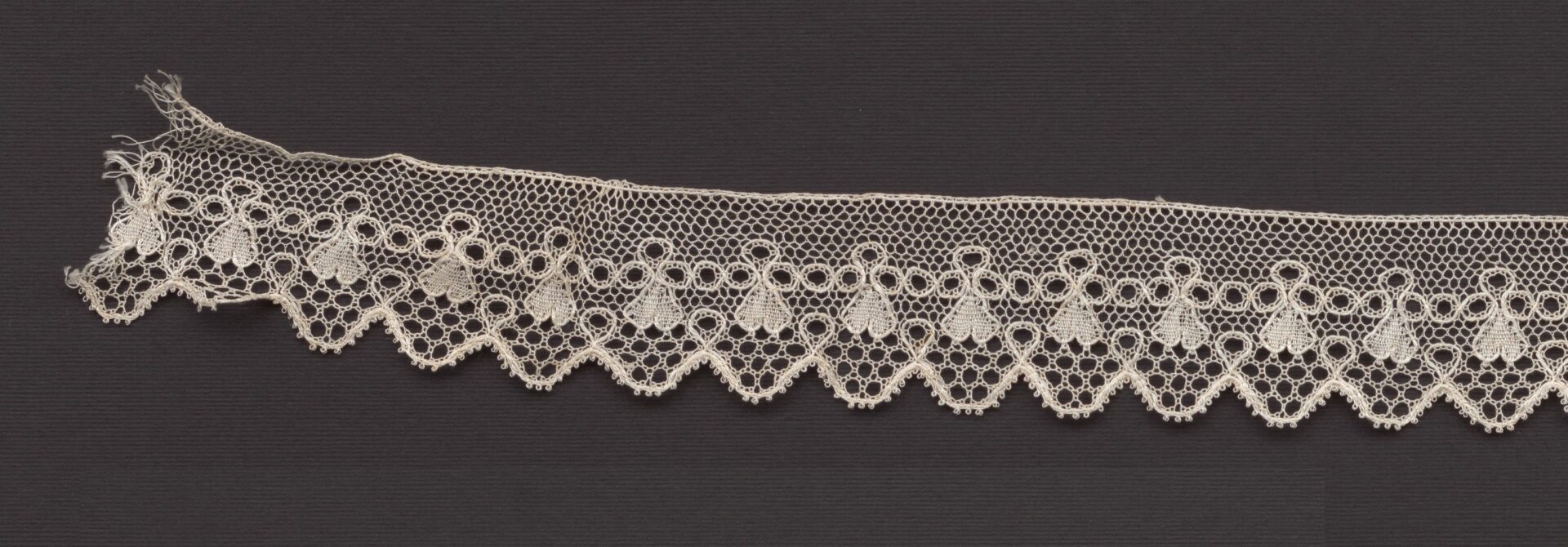 Paličkovaná čipka z bielych bavlnených nití, typ krajniansky. Základ tvorí riečička pletená tylovou väzbou, do ktorej je pletený motív opletaný hrubšou niťou. Na vonkajšom okraji sú zúbky. Väzby plátenko, pletence, oká, mitky/pikotky, vplietanie hrubšej nite.