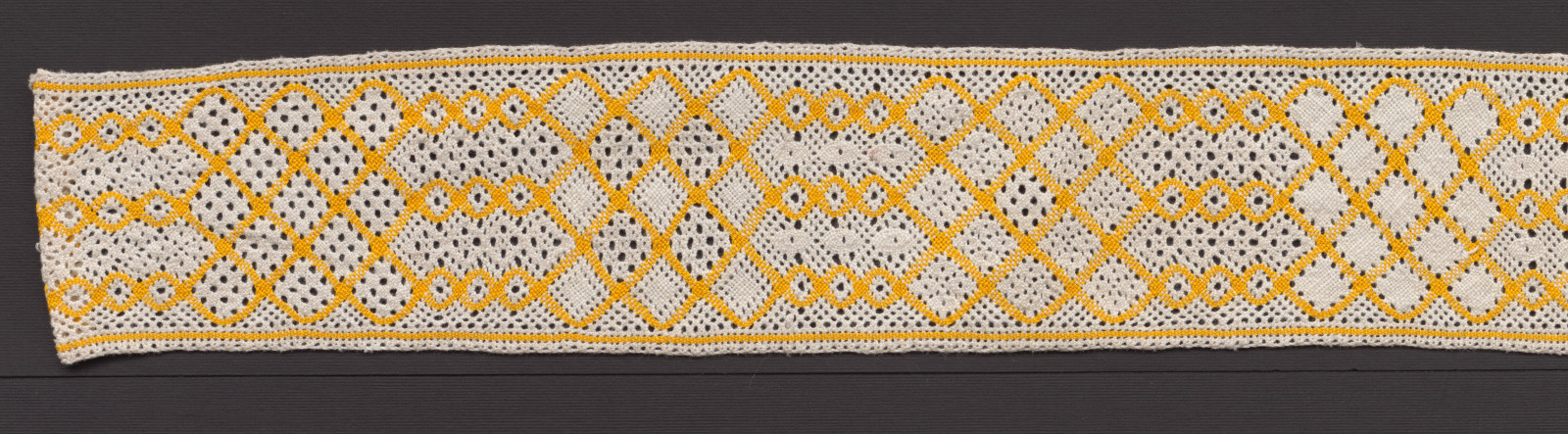 Mnohopárová paličkovaná vložka, typ novohradský. Vyrobená je z bielych a žltých bavlnených nití, väzby plátenko, hrachovinka, oká, dierková väzba. Názov vzoru na drumble.
