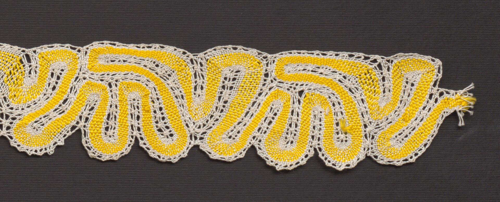Paličkovaná čipka pásikového charakteru, typ slovenskogrobský. Materiál je surový hodváb prírodnej farby a farbený žltý.