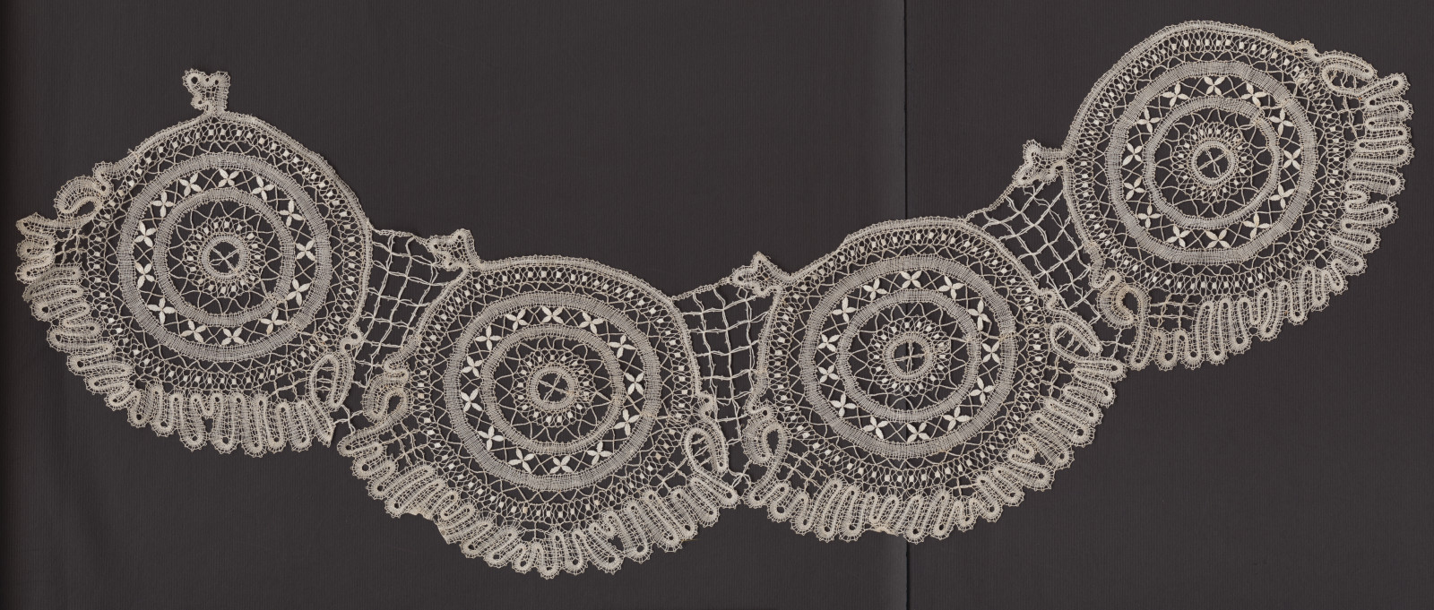 Paličkovaný motív z bielych nití na šitie. Väzby plátenko, ploštičky, lístky, pletence a mitky/pikotky. Celý motív tvoria štyri samostatné motívy pletené do hruhu.