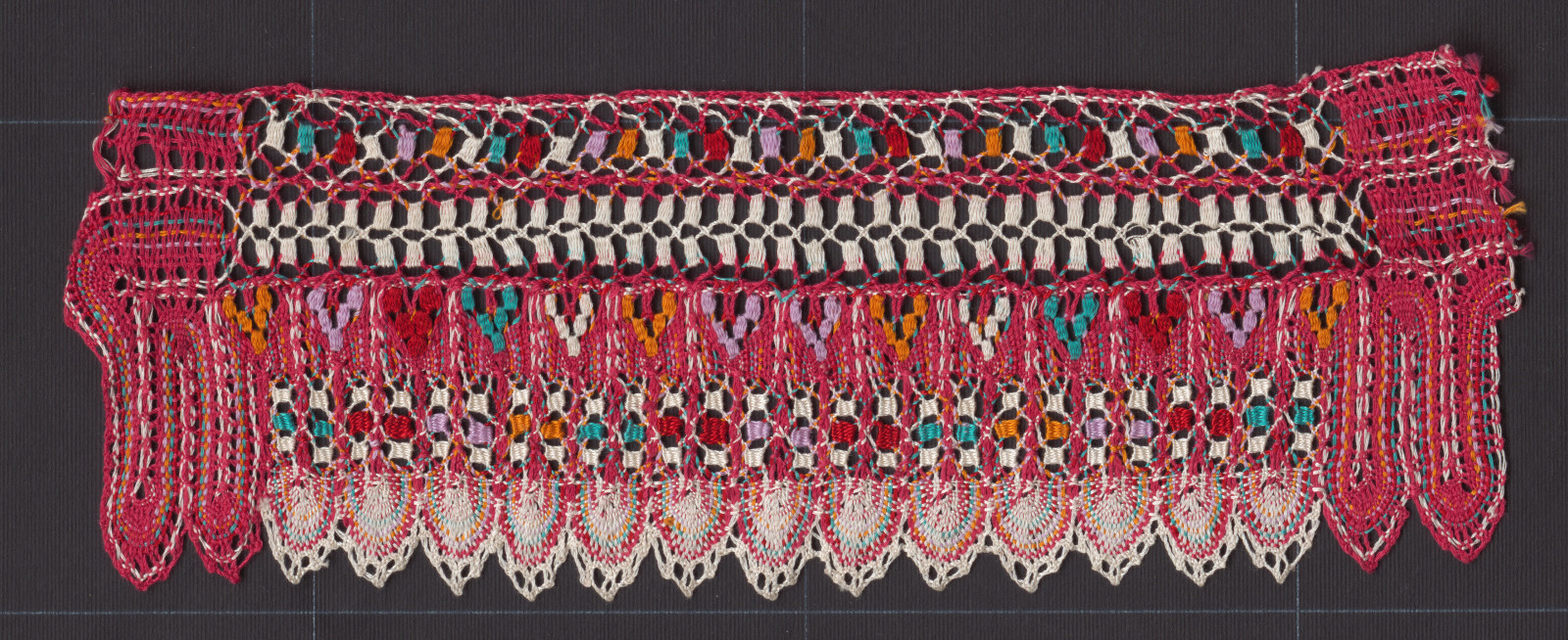 Paličkovaná čipka na čepiec. Čipka je vyrobená z bavlnených nití na vyšívanie, farby červená, biela, oranžová tyrkysová a fialová. Väzby plátenko, ploštičky, dierky, okraj tvoria zúbky.