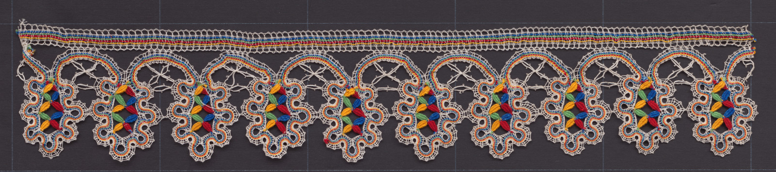 Pásiková čipka, typ soľnobanský. Základom je pásik vlnoviek nazývaných jabluška. K vlnovkám je pripojený jeden pás mnohopárovej čipky tzv. ketješka. Použité sú typické farby – červená, zelená, oranžová a modrá.