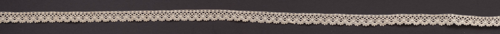 Paličkovaná čipka, banícka. Materiál biela bavlnená niť na šitie, väzby pletence, plátenko, oká. Získané zo Spolku pre zveľaďovanie domáckej výroby.