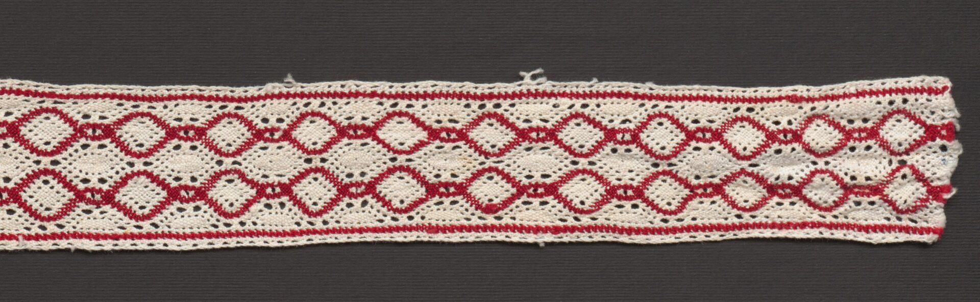 Mnohopárové vložky, typ novohradský. Materiál biele a červené bavlnené nite na tkanie. Väzby plátenko hladké a prekladané, dierky, oká. Vzor vo dvoje drumble.