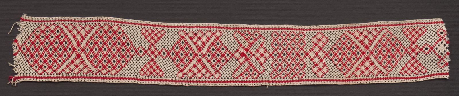 Mnohopárová čipka, typ novohradsky. Základom je riečička fareby ecru, do ktorej je vťahovaná hrubšia červená niť, ktorá lemuje geometrické motívy. Väzba plátenko hladké a prekladané, dierky, oká. V prednom a zadnom pruhu obe plátenká, v drieku kosé motívy.