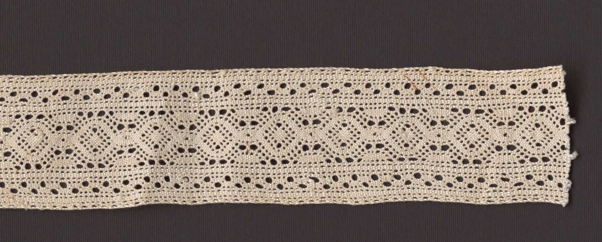 Mnohopárová čipka, typ novohradský. Materiál biela bavlnená niť na vyšívanie, väzby plátenko hladké a prekladané, oká. Čipka bez riečičky, motív „vo jednu drublu“, pruhy „na osem“.