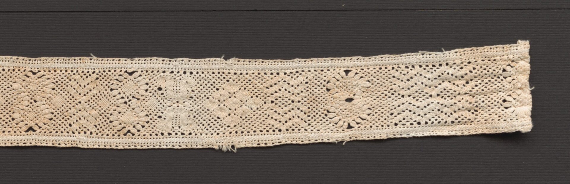 Mnohopárová čipka, typ novohradský. Materiál biele ľanové nite na tkanie a nite na vyšívanie. Väzby plátenko hladké a prekladané, pavúčky, lístky. Názov vzoru prieraví.