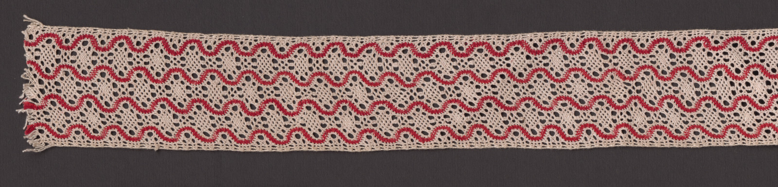 Mnohopárová čipka, typ novohradsky. Čipka je vyrobená z bavlnených nití, farba ecru a červená, väzby hrachovinka a plátenko. Čipka má rovné okraje.