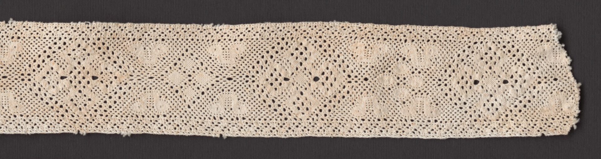 Mnohopárová čipka, asi z rukávcov, typ novohradský. Zhotovená je z bavlnených nití na tkanie, väzby plátenko hladké a prekladané, dierky, hrachovinka, lístky, pavúčky. Predný a zadný diel plátenko a dierky, v drieku plátenkové motívy s hrachovou výplňou, pletencové s lístkami.