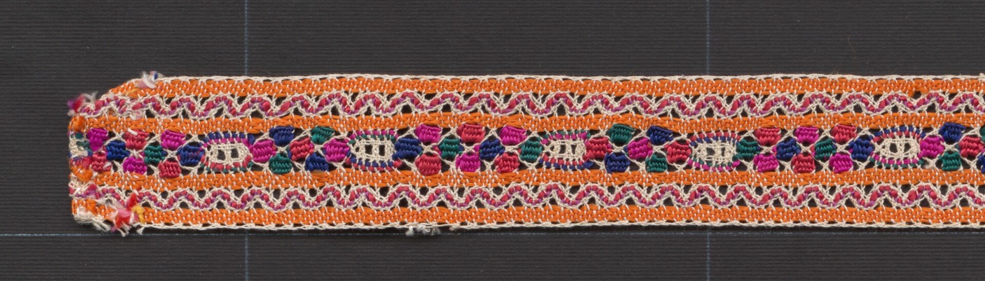 Paličkovaná vložka, typ šoporniansky. Mnohopárová vložka je komponovaná do radov ohraničených plátenkovým pásikom. Čipká je hustá vyrobená z pestrých hodvábnych nití, väzby ploštičky, plátenko, pavúčik s dvoma dieročkami.