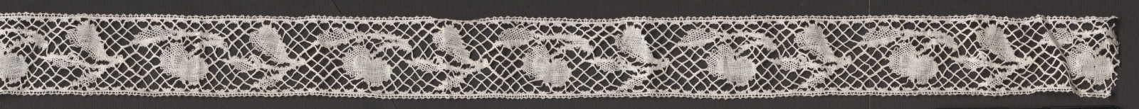 Mnohopárová čipka, typ banícky. Materiál biele bavlnené nite, väzby pletence, plátenko, motív jabĺčok. Kúpené zo Spolku pre zveľaďovanie domáckej výroby.