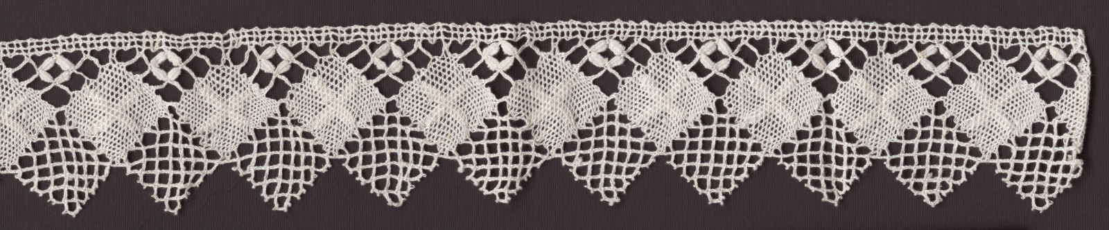Mnohopárová čipka, typ banícky. Materiál biele bavlnené nite, väzby pletence, plátenko, lístky, motív kosoštvorcov. Na vonkajšom okraji zúbky v tvare mriežky. Získané zo Spolku pre zveľaďovanie domáckej výroby.