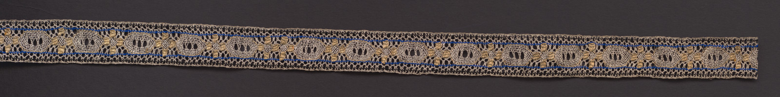 Paličkovaná čipka upletená zo zlatých a strieborných kovových nití a z čiernych a modrých hodvábnych nití. Väzby plátenko, pletence, oká, ploštičky.
