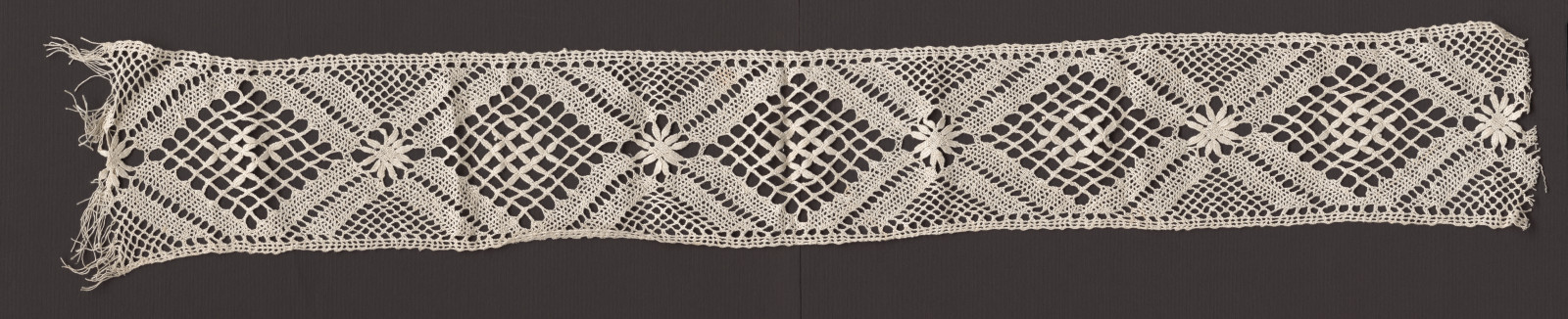Paličkovaná mnohopárová čipka. Materiál biele ľanové nite, väzby polpára, lístky, pletenec. Vzor tvoria veľké kosoštvorce s lístkami v strednej časti, ktoré sa striedajú s kvetinovým motívom.