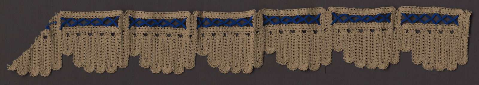 Pásiková čipka z konopných nití v kombinácií s kontrastnou modrou bavlnkou. Väzby plátenko hladké a prekladané, lístky.