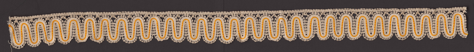 Pásiková čipka z bavlnených nití. Väzby plátenko, jednopárový pletenec, mitky. Stredom pásiku prechádza farebný žlto-oranžový pruh.