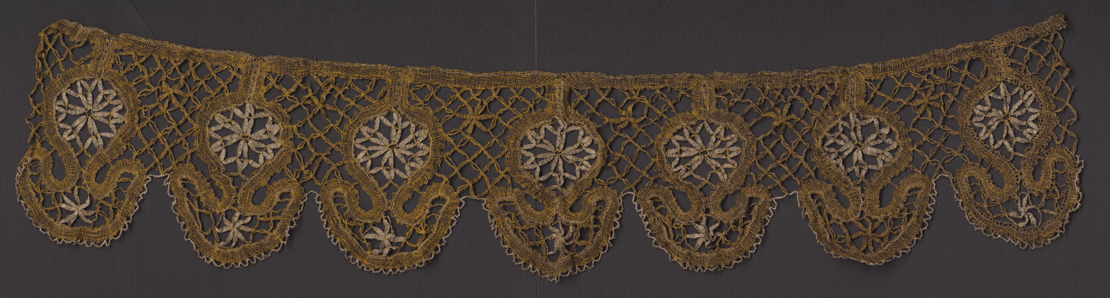 Paličkovaná čipka so zúbkami zo zlatej a striebornej nite. Väzby plátenko, lístky, pletence, mitky/pikotky.