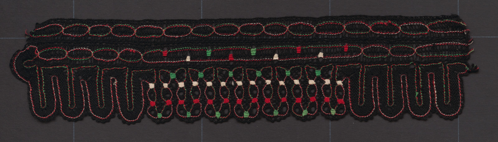 Paličkovaná čipka na čepiec. Čipka je vyrobená z čiernej priadze, zdobená ploštičkami červenej, zelenej a bielej farby.
