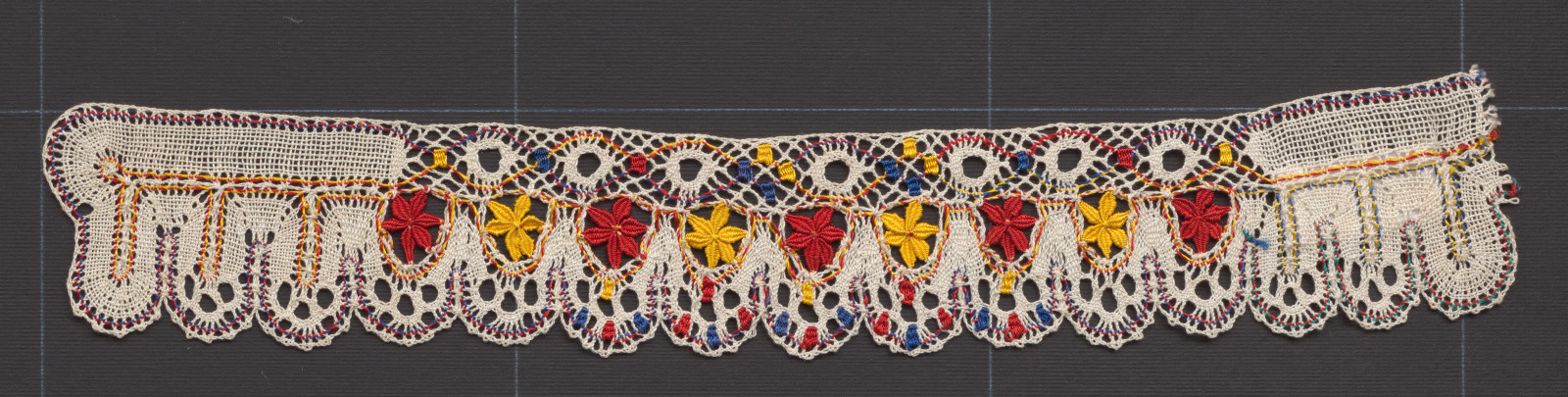Čipka je upaličkovaná z háčkovacej priadze a z farebnej hodvábnej priadze. Čipka bola určená na čepiec, tvorila jeho čelenku.